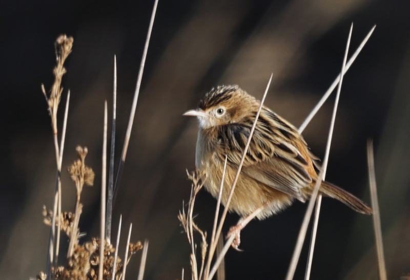La Cisticole des joncs est un petit passereau au corps compact. Le plumage du dessus apparaît brun noirâtre, rayé de chamois et la tête brun foncé, rayée de beige, avec une zone plus claire autour de l'oeil. Son bec rose est légèrement courbe. Sa queue est courte et souvent étalée. Le dessous est beige pâle uni. Ses pattes sont roses.