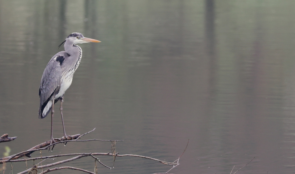 Le Héron cendré est facile à reconnaitre en raison de sa taille, de ses longues pattes d'échassier, de son long cou et de son bec en forme de poignard jaune-orange. Son dos est gris. Sa gorge est blanche striée verticalement de noir. Le mâle ne se distingue de la femelle qu'en période de reproduction avec des teintes plus vives.