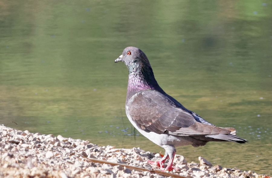 Le Pigeon biset sauvage a un plumage gris clair avec deux barres noires sur les ailes et des tons plus foncés, verts et violacés, autour du cou. En vol, on peut remarquer le dessous des ailes et le croupion de couleur blanche. La base du bec possède une caroncule blanche.